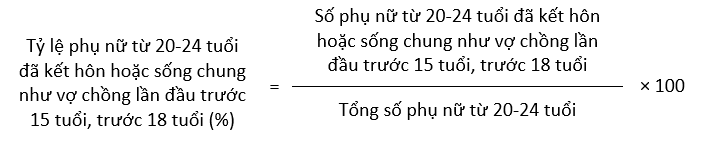 Tỷ lệ phụ nữ từ 20-24 tuổi đã kết hôn hoặc chung sống như vợ chồng lần đầu trước 15 tuổi, trước 18 tuổi là phần trăm số phụ nữ từ 20-24 tuổi đã kết hôn hoặc chung sống như vợ chồng lần đầu trước 15 tuổi, trước 18 tuổi so với tổng số phụ nữ từ 20-24 tuổi.